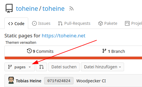 Jedes Mal, wenn Änderungen im Hugo-Projekt (im Quellen-Repo) durchgeführt werden, wird im Anschluss ein Commit erzeugt und in mein Codeberg-Repo gepusht toheine_sources . Dieses Event wird von der Codeberg CI registriert, der dort verwendete Woodpecker beginnt die Hugo-Files zu bauen und hinterlegt die so erzeugten Dateien im Pages-Repo toheine . Letzteres nutzt Codeberg Pages, der die Dateien unter einer Domain als Webseite bereitstellt.