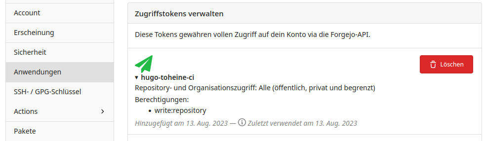 ). Wichtig ist allerdings, dass bei Verwendung die Codeberg CI die beiden Variablen mail und codeberg_token gesetzt werden. Den Token müssen wir vorab im Codeberg-Konto generieren: