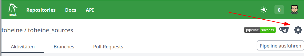 Über den Button “Repository hinzufügen” wählt man das Quellen-Repo aus und klickt auf “Aktivieren”. Wenn das hinterlegt ist, brauchen wir noch eine Pipeline im Quellen-Repo, dass den Namen .woodpecker.yml trägt. Letztendlich ist das die Abfolge an Befehlen, die von der Codeberg CI (Woodpecker) ausgeführt wird, sobald eine Änderung auf Codeberg erfolgt. Freundlicherweise, liegen für viele erdenkliche Szenarien schon Beispiele bereit (siehe hier