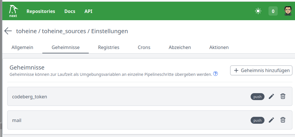 Im letzten Schritt der Einrichtung hinterlegen wir die beiden oben erwähnten Secrets noch in Woodpecker. Dazu im Repo (also auf https://ci.codeberg.org/ ), in den Einstellungen …