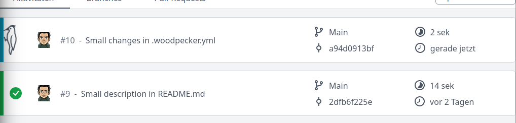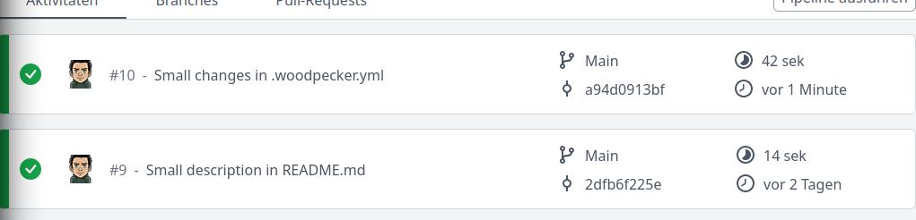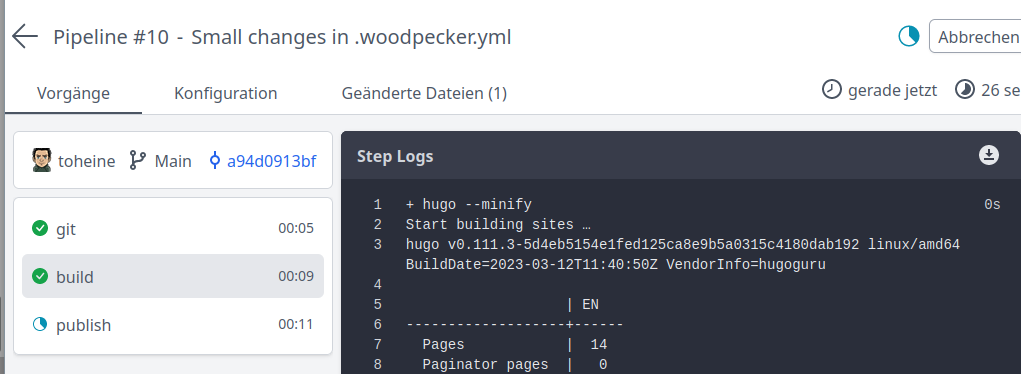 Wenn Änderungen im Hugo-Projekt durchgeführt und versioniert werden, bekommt das Woodpecker mit. Codeberg CI erstellt die Seiten und veröfffentlicht diese auf Codeberg Pages. Wenn man nach einem commit, das Projekt in das Quellen-Repo auf Codeberg pusht, kann man den Prozess in der Woodpecker-Webui verfolgen: