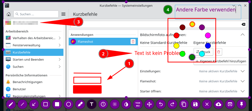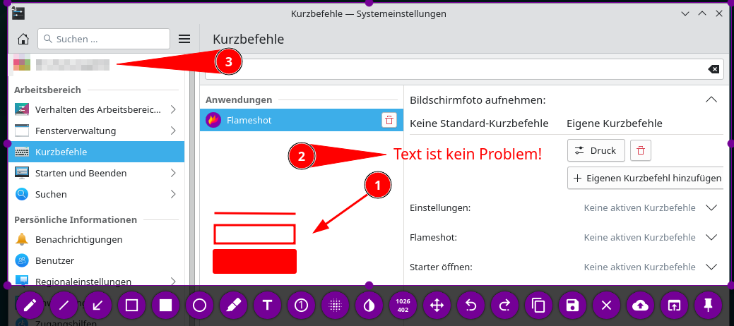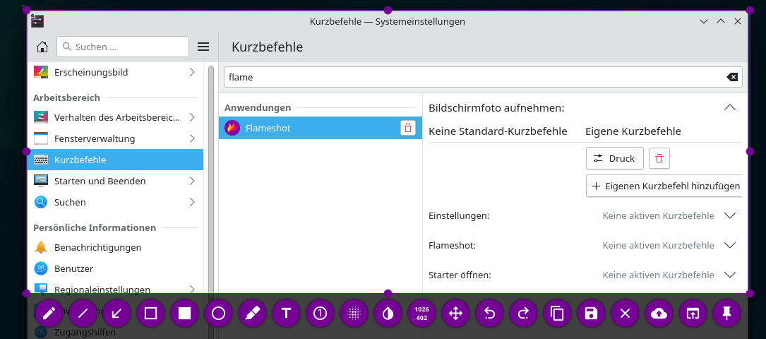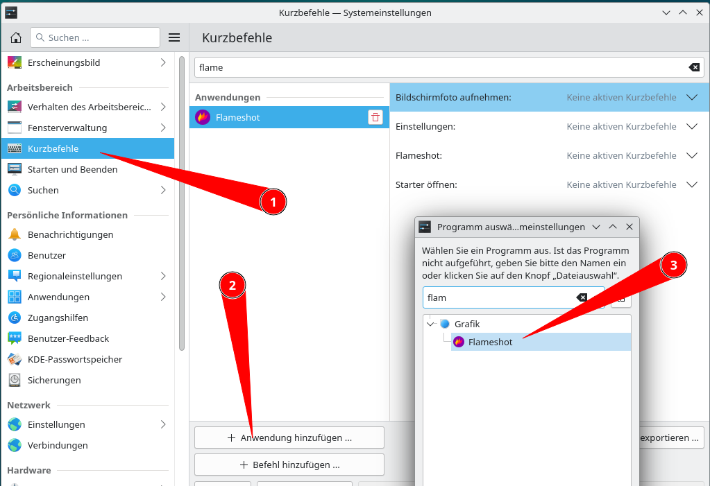 Auf Windows ist Flameshot direkt nach Installation einsatzbereit. Mit der Taste [Druck], kann ein Screenshot erstellt und direkt bearbeitet werden. In einer Linux-Distro wird mit dieser Taste nach wie vor das Screenshot-Tool verwendet, das der jeweilige Distributor zu Verfügung stellt. Daher muss die Tastenbelegung noch angepasst werden. Unter KDE erreiche ich das unter Systemeinstellungen > Kurzbefehle > + Anwendung hinzfügen. Im nachfolgenden Dialog sucht man nach flameshot und bestätigt die Eingabe mit OK.