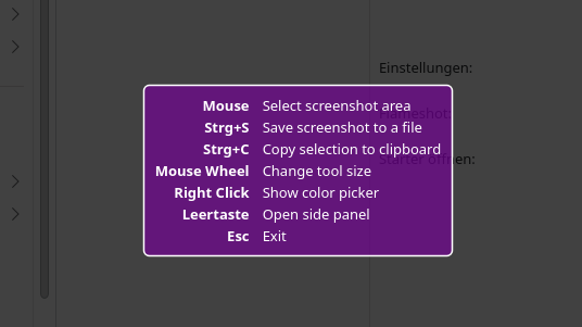 Sobald Flameshot über den gesetzten Kurzbefehl aufgerufen wird, verändert sich der Cursor und es erscheint ein Hinweis-Fenster: