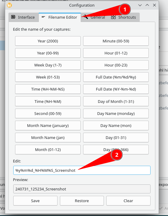 Hier können das grundsätzliche Design angepasst, Schaltflächen ausgeblendet, Speicherpfade vorgegeben und Shortcuts eingesehen werden. In der Regel lasse ich das unverändert … mit einer Ausnahme: Unter “Filename Editor” passe ich den Default-Name für einen zu speichernden Screenshot wie folgt an: