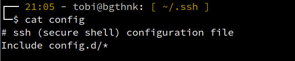 Zudem gibt es im eigenen Verzeichnis unter ~/.ssh/config die Möglichkeit eine Konfigurationsdatei zu hinterlegen. Diese ist nur für den jeweiligen User gültig und der Ort der Wahl für unseren weiteren Anpassungen.