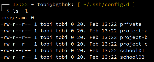 Es können auf diese Weise zahlreiche Zielhosts angegeben und einfach aufgerufen werden. Hier hat es sich übrigens für mich bewährt, dass ich pro Projekt eine eigene Config-Datei vorhalte. Dazu hab ich in meiner ~/.ssh/config die Anweisung Include config.d/* hinterlegt …