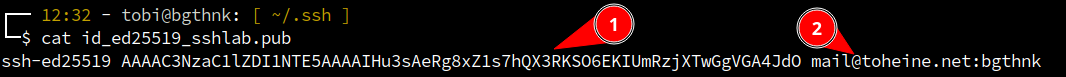 Die Datei mit der Endung .pub enthält den öffentlichen SSH-Schlüssel (1) sowie den Kommentar (2), den wir bei Erzeugung mit der Option -C übergeben haben: