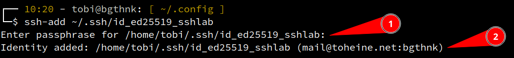 Wir werden (1) nach der entsprechenden PASSPHRASE gefragt, die wir eingeben und erhalten im Anschluss die Meldung (2), dass der Key (die Identität) hinzugefügt wurde: