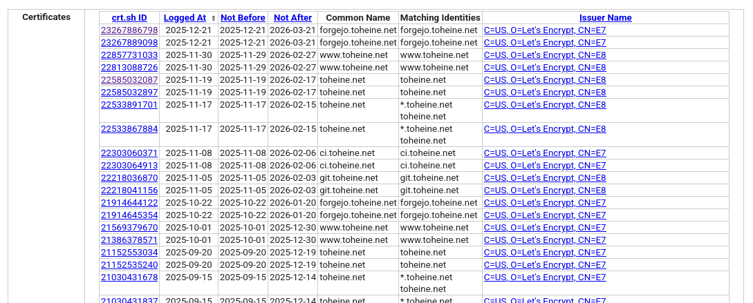 Natürlich sind die ausgestellten und produktive Zertifikate im Internet und damit für alle Welt einsehbar. Aber mir war nicht klar, dass jede Erzeugung auch offen im Netz steht (auch wenn ich das Zertifikat nicht nutze). In Zukunft werde ich wohl in meinen Fortbildungen keine exemplarischen Zertifikate auf den Namen <name>-is-doof.meine-domain.tld erzeugen 😉 .